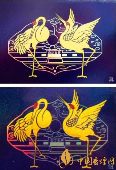 真煙的logo印刷套色分明,圖案上的鶴嘴尖部上長(zhǎng)下短,頭頂部紅黃色層套色均勻細(xì)致,眼睛栩栩如生,“白沙古井”字體粗細(xì)一致、飽滿,整體未見顏色圖層重復(fù)、錯(cuò)位情況;假煙的logo印刷顏色死板,圖案上的鶴嘴部上下長(zhǎng)短幾乎一致,鶴頭頂部紅黃色層套色有明顯錯(cuò)位,眼部線條粗細(xì)不一、且因套色錯(cuò)層導(dǎo)致眼睛看上去無神,“白沙古井”字體粗細(xì)不一、印刷線條偏細(xì),顏色圖層有重復(fù)、錯(cuò)位情況。