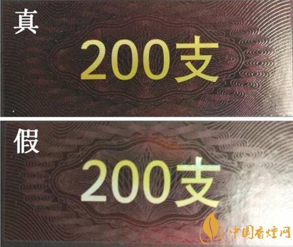 真煙條盒側(cè)面,小盒頂部均采用與人民幣相同效果的鈔線防偽技術(shù),由無數(shù)根交叉防偽細(xì)線編織在一起,油墨厚,交叉線條根根清晰完整無缺,線條錯(cuò)中有序,立體感強(qiáng)。假煙采用掃描復(fù)制技術(shù),其交叉線條清晰度差,無立體感,與真品防偽技術(shù)存在明顯差異。