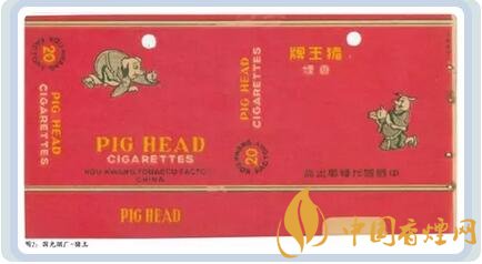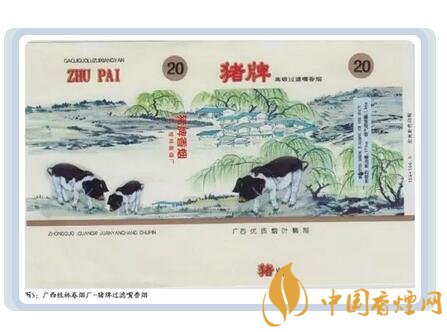 廣西桂林卷煙廠生產(chǎn)過一款豬牌煙標,圖案是三頭花豬正在春風(fēng)柳綠的村莊外的山地上覓食,包裝上對焦油量、煙氣煙堿量有明確的標識。