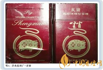 山東濟南卷煙廠曾出品過采用中國民間傳統(tǒng)的剪紙手法設(shè)計,底色為紅色的 “亥豬”煙標。圖案上是一頭肥嘟嘟的花豬形象,其短小的四肢似乎支撐不了它的重量,兩只豎立的耳朵和張開的小嘴,表明它正在尋找食物,看上去十分溫馴、可愛。