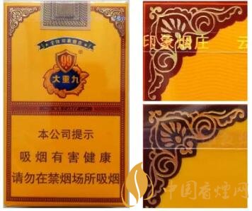 假冒卷煙:1.該款假冒卷煙盾牌、大重九字體、花團圖案等商標未做凹凸處理。2.大重九字體筆畫粘連,藍色底紋顏色偏差較大。