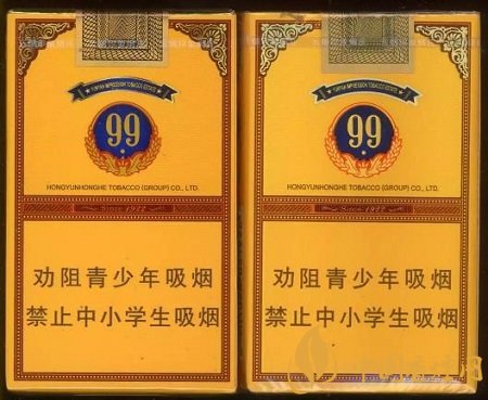 假煙:1.橫幅圖案邊框偏白色,底紋無網格狀。2.中間“99”圖案,色彩無明顯過度效果,整體偏黑色。