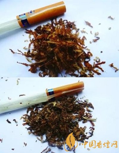 真品煙絲以精選國內外自然醇化兩年以上的優(yōu)質烤煙為原料,切絲均勻一致,顏色均為金黃色,葉絲比例高;假煙煙絲多為劣質煙葉經(jīng)過化學藥劑催化加染加工而成,煙絲表面多存留一些白色香精粉末,煙絲顏色多為褐色,與真品特征存在明顯差異。(上真下假)