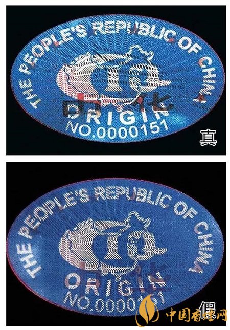 4、“中華”原產(chǎn)地標(biāo)志為藍(lán)色橢圓形,折光可見(jiàn)“中華”字樣、8顆“★”及天安門圖案。真煙色彩飽滿,圖案清晰;假煙色彩暗淡,圖案模糊。