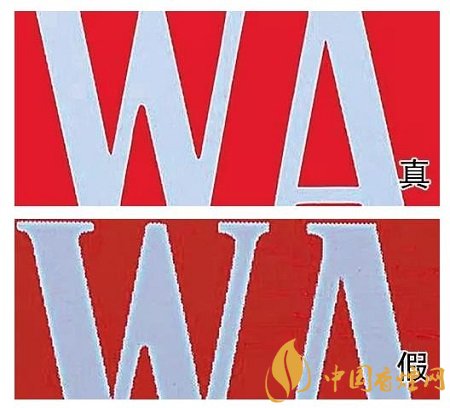 6、真煙白色字體邊緣規(guī)整光滑,字跡飽滿;假煙白色字體邊緣粗糙,色彩污濁,有明顯鋸齒印。