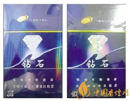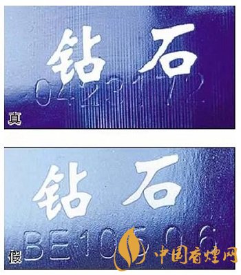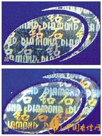 真煙鉆石圖案印刷清晰,色彩感強(qiáng),內(nèi)有微縮英文字母“DIAMOND”,圖案無(wú)凹凸感;假煙印刷不清晰,用手摸上去有凹凸感。