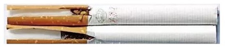真煙煙支采用單一醋纖濾嘴,長度為25mm;假煙煙支過濾嘴較短,長度約為21mm,與真品特征存在明顯差異。(上真下假)