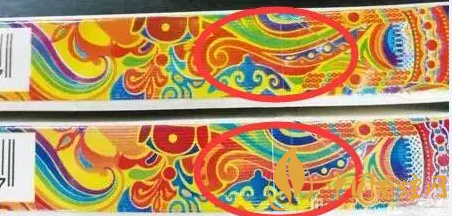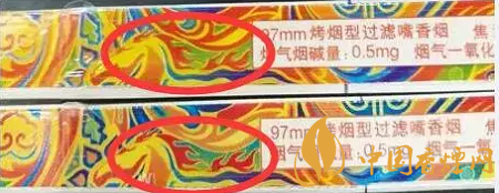 如下圖標(biāo)示,此處圖案真煙為藍(lán)色,假煙則變成了綠色;真煙的線(xiàn)條為黃色,假煙變成了紅色;真煙為綠色的圓珠外面為藍(lán)色的底色,假煙都變成了綠色。(上假下真)