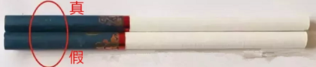 真品卷煙的濾嘴棒為兩排激光打孔;假冒卷煙的濾嘴棒沒(méi)有激光打孔或者打孔不透氣,并且煙支較短。