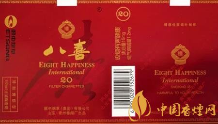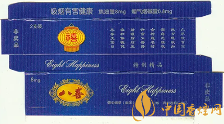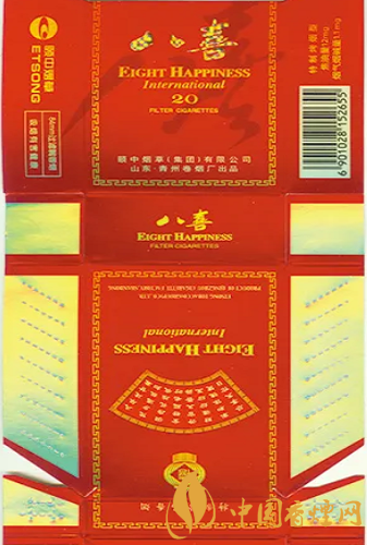 “八喜”香煙高貴典雅的煙標(biāo)裝潢設(shè)計,曾獲得第八屆華東裝潢設(shè)計大獎?wù)棺罴褎?chuàng)意獎。“八喜”香煙問世后,青州卷煙廠得知人們很想知道“八喜”具體指哪“八喜”,于是該廠于1999年向社會廣泛征集吉祥語,從中精選出“久旱逢甘霖、他鄉(xiāng)遇故知、洞房花燭夜、金榜題名時、升官又晉爵、財源紛紛至、家和體魄健、盡享天倫日”等八句具有代表性的吉祥語,作為“八喜”的詮釋和具體所指。