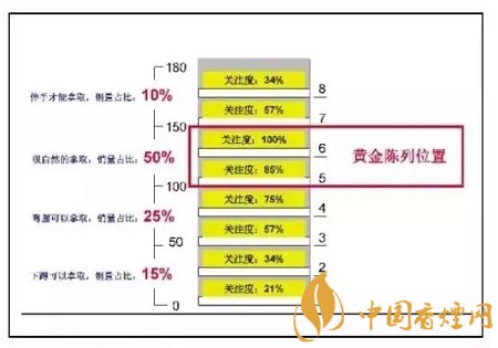 在同一組貨架上,因?yàn)轭櫩妥⒁暤姆绞讲煌?,所以不同陳列位置產(chǎn)生的銷量會(huì)有不同的變化,一般來(lái)說(shuō),與視線平齊的位置陳列的商品銷量最高,而顧客需要仰望和蹲下才能注視的商品銷量相對(duì)要低。
