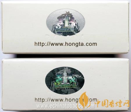 背面商標(biāo)紙印刷工藝差異對(duì)比:真品商標(biāo)紙采用白卡紙,凹印印刷,“Hongtashan”字體用手摸沒(méi)有凹凸感,“紅塔”左邊上下兩朵云距離塔身較遠(yuǎn);假煙采用高清掃描仿制印刷,“Hongtashan”字體用手摸有凹凸感,“紅塔”左邊上下兩朵云離塔較近,與真品特征存在明顯差異。