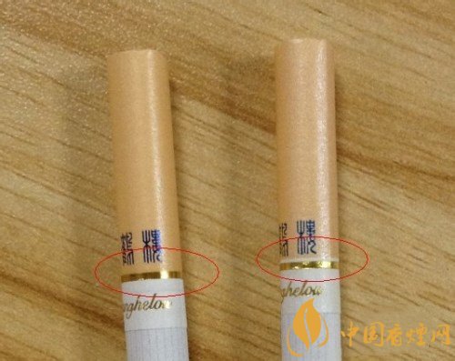 左邊真煙金色圓圈部位與煙嘴結(jié)合比較完美,毫無縫隙,而且色澤靚麗印刷不拖泥帶水,細(xì)看右邊的金色圓圈與煙嘴結(jié)合空隙較大,中間居然脫節(jié)了。而且光圈也比較粗糙。