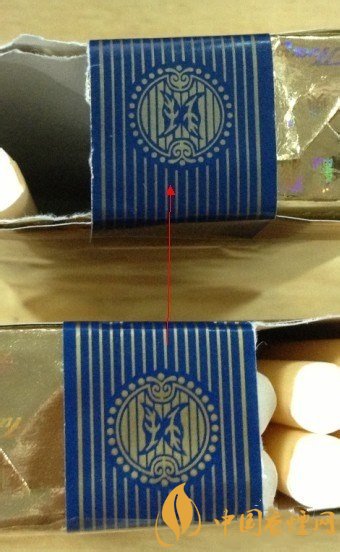 下面的真煙藍(lán)色部位顏色光鮮,有色澤,而上面的假煙略顯暗淡。從中間的圓圈部位不難分辨出來。