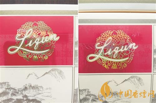 商標(biāo)紙印刷工藝差異對比:真煙“Liqun”字母以及花球的圖案清晰,線條清晰飽滿,立體感較強。假煙圖案整體較為模糊,字體不飽滿,邊緣不清晰,無立體感。