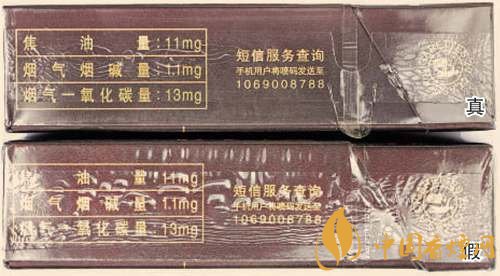 真煙商標紙采用復合鐳射銀卡紙,膠印和絲網印刷,“和天下”字體采用壓凸燙金工藝,用手摸凹凸感較明顯,且字體筆畫較粗,商標紙上字體、拼音、花紋看上去有較清晰的豎線;假煙一般為高清掃描仿制印刷,“和天下”字體用手摸凹凸感不明顯,且字體筆畫較細,商標紙上拼音、花紋等處豎線較模糊。
