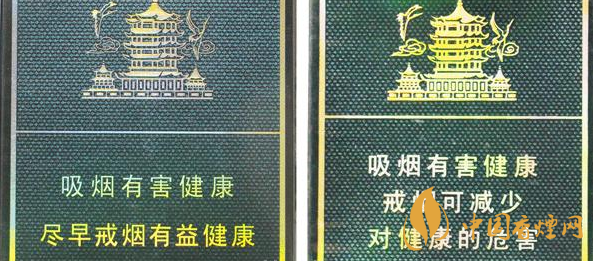 盒包正面包裝膜材質及印刷對比:真品卷煙盒包裝膜材質光滑,“吸煙有害健康”清晰無毛刺,黃鶴樓圖案套色清晰。假煙盒包裝膜材質不平整有皺褶,“吸煙有害健康”文字邊緣有毛刺,黃鶴樓圖案套色不清晰。