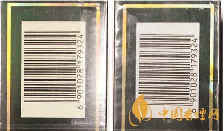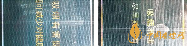 煙用包裝膜材質及條形碼對比:真品卷煙條包裝膜材質光滑,均勻無皺褶,條形碼區(qū)域呈淡黃色,套色均勻清楚。假煙條包裝膜材質粗糙,有不均勻皺褶,條形碼區(qū)域為白色,套色邊緣放大后模糊不清。