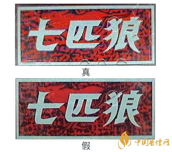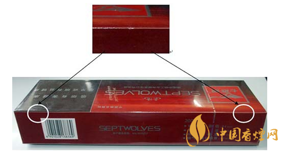 由于印刷方式的不同,真品“七匹狼”(豪情)條、盒上的中英文字體邊緣有鋸齒狀,假煙的字體邊緣光滑。