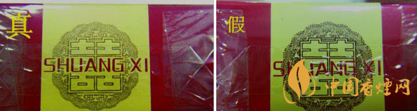 真假商標(biāo)紙顏色差異比對:真品商標(biāo)紙顏色為深紅色,正面喜字燙金邊緣有凸起感;假煙商標(biāo)紙顏色多為鮮紅色,正面喜字為平版印刷且邊緣未見凸起感,與真品存在明顯差異。